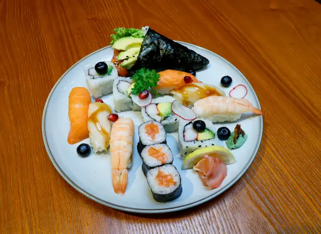 H91 Gentlemans Teller (2 Lachs Sushi, 2 Thunfisch Sushi, 2 Ebi Sushi, 4 Futomaki, 3 Maki, Temaki)